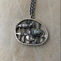 レトロな雰囲気漂うフィッシュデザインのヴィンテージネックレス。海藻が揺らめく海の中を2匹の魚が泳ぐ様子が表現されています。キラリと輝くアバロンシェルもポイント。存在感があり古着やユニセックスなスタイルにもオススメです。