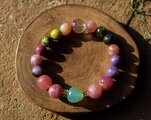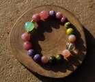 中心に12ミリx12ミリのブルーカルセドニー、マダガスカルローズクォーツAAA級の12ミリ、10ミリのレピドライト、10ミリのアトランティサイト、10ミリのカルセドニー、最後に13ミリのガーデンクォーツを組ませました。
