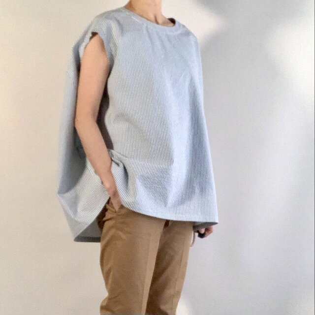 ・袖無しですが、上腕部を覆ってくれて、後ろからも腕をカバーしてくれる分量感あるデザイン。