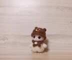 茶色の帽子とマフラーを身につけた、可愛らしい羊毛フェルトのマスコットです。