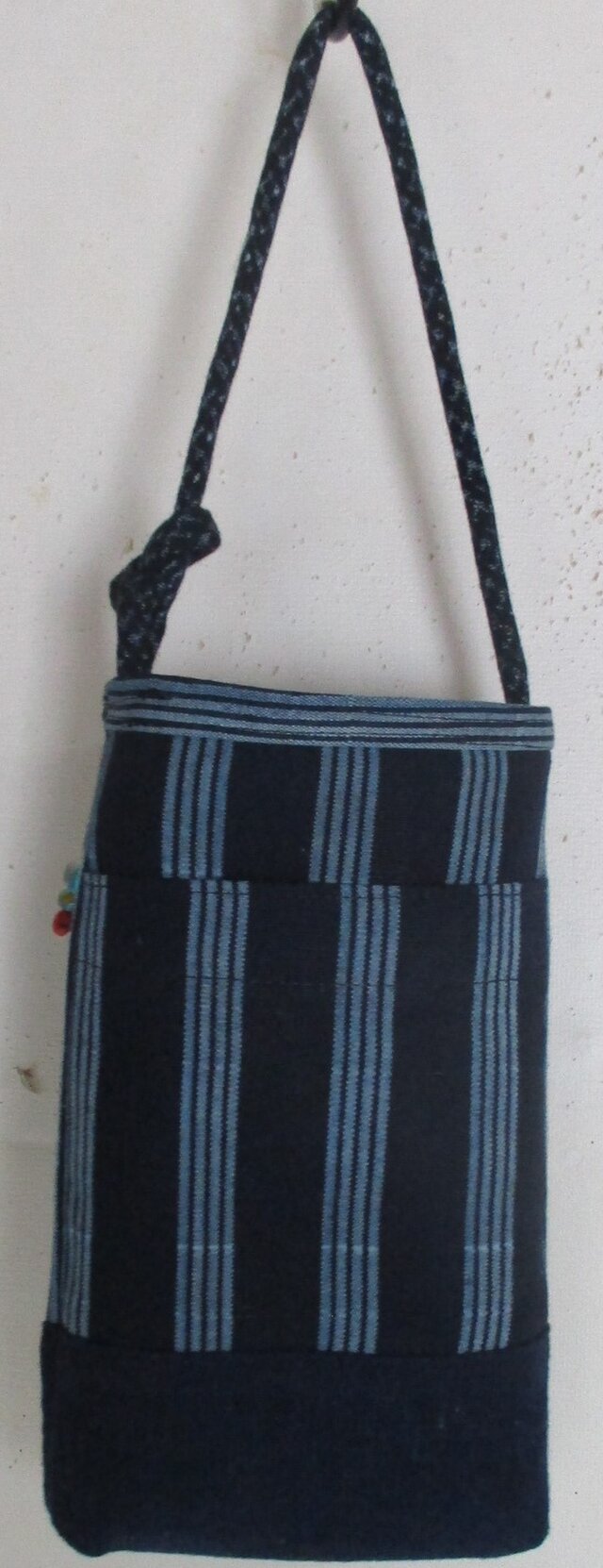 片側につけた、男絣のループの輪っかの中を通して結んで下げるようにしています。