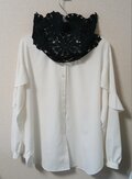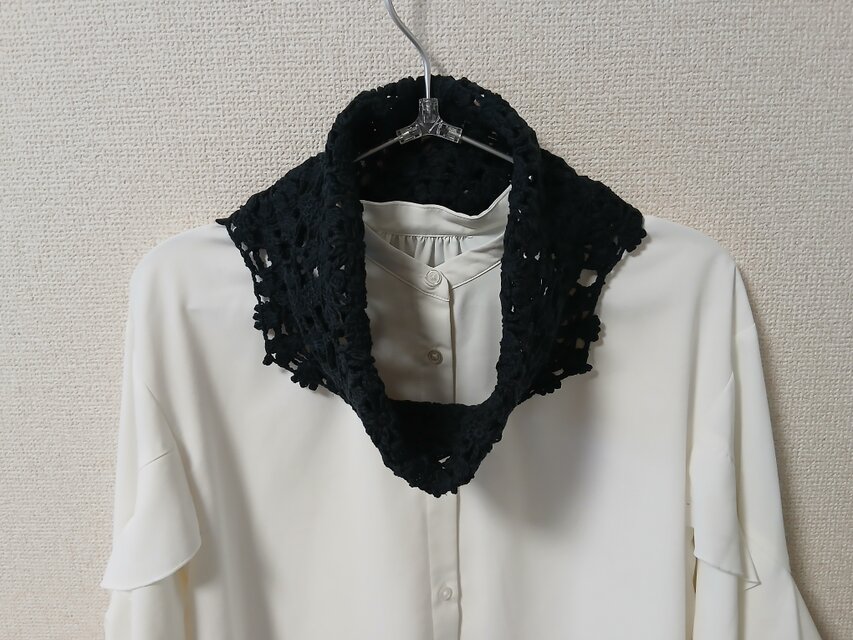 月明かりに照らされて揺れる繊細なモチーフのように、深いインクブラックのハーフスヌードが首元に静かな存在感を添えます。