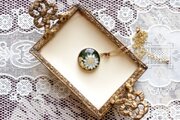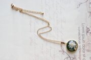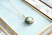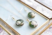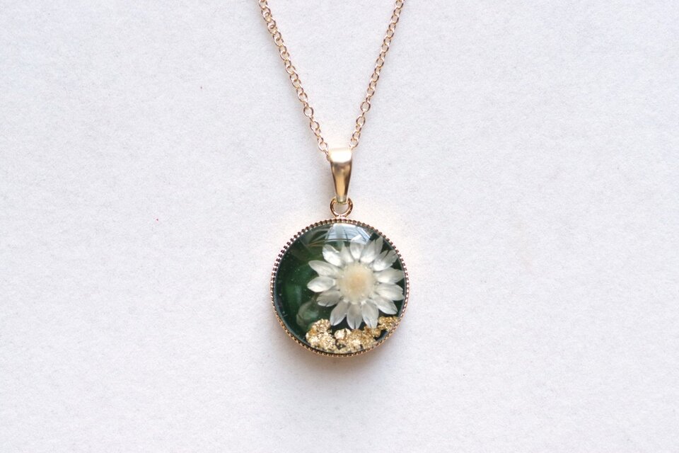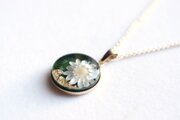 深い緑のレジンに、白いお花をあしらったナチュラルで愛らしいペンダント。