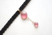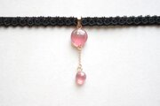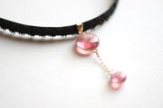 ぷっくり張りつめた大小の水滴のような透明感に魅入ってしまうレジンを、ベルベットリボンにタティングレースで装飾を施したチョーカーに仕上げました。