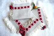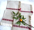 ベージュに赤のライン装飾、フリンジ飾りのテーブルナプキン 8枚セット