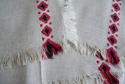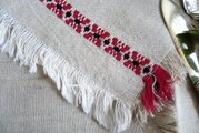 濃いベージュに赤と黒の織模様で装飾されたテーブルナプキンです。