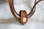 肩から斜めに掛けられるレザーのストラップがしっかりと縫い付けられています。