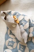 開閉部は、竹のバー型のボタンを糸ループで留める仕様です。