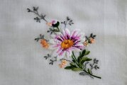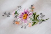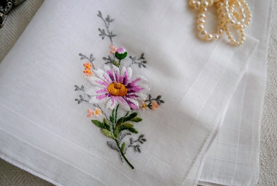 一輪のデイジーと小花を手仕事の刺しゅうで飾った