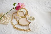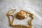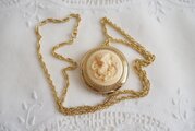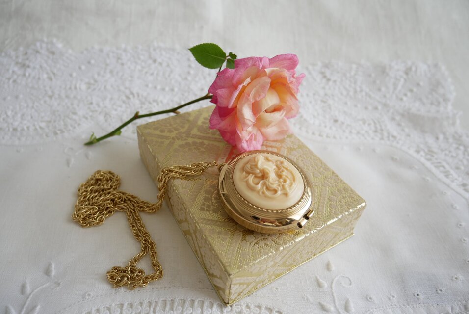 ゴールド色のメタル製で、表面に樹脂製で女性の横顔のカメオの装飾があります。