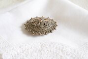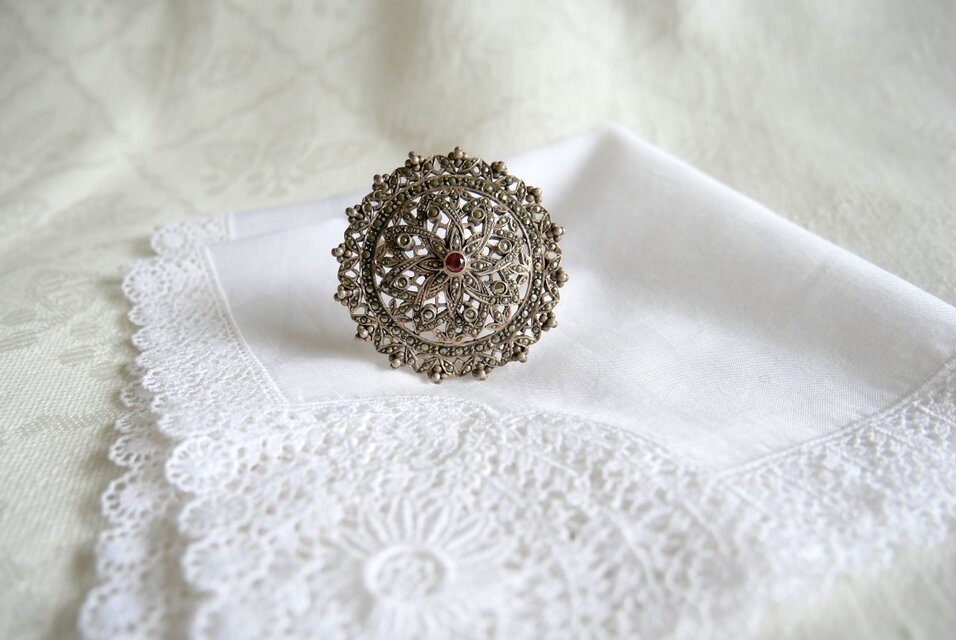 中心にルビー風のオーナメントを飾った、やや大ぶりのブローチです。