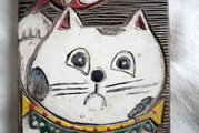 一生懸命な顔の三毛猫さんが、右前脚を上げている看板です。