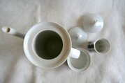 *縦長のポット、フタ付きのシュガーポット、クリーマーの3点セットです。