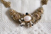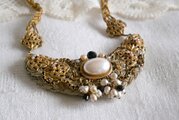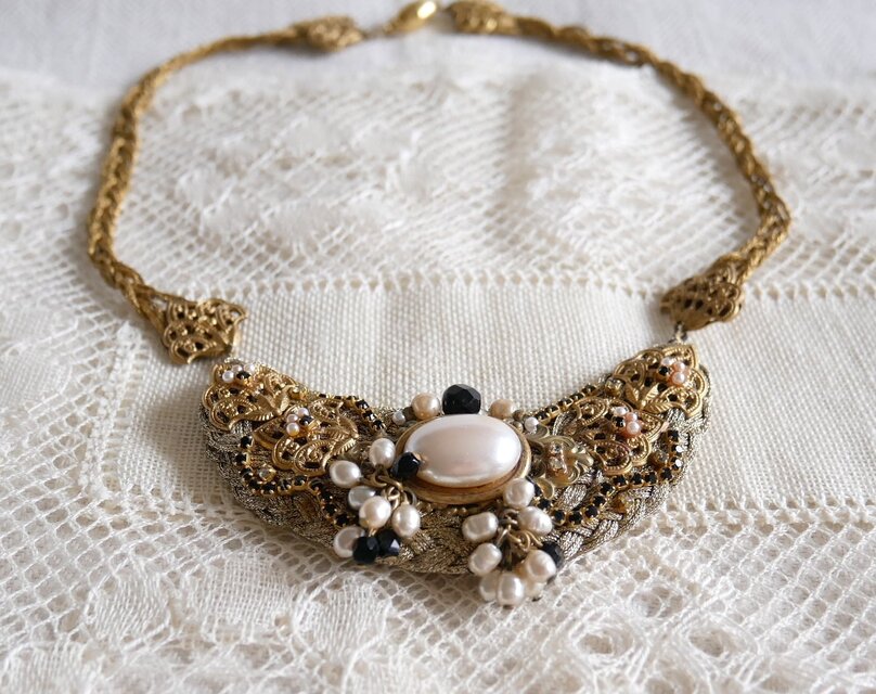 大小のフェイクパールと黒のラインストーンを飾った