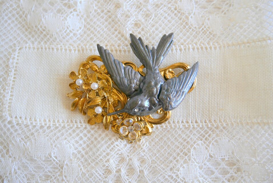 ハチドリ(ハミングバード)が花の蜜に魅せられている光景のブローチです。