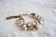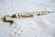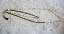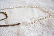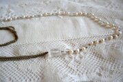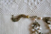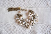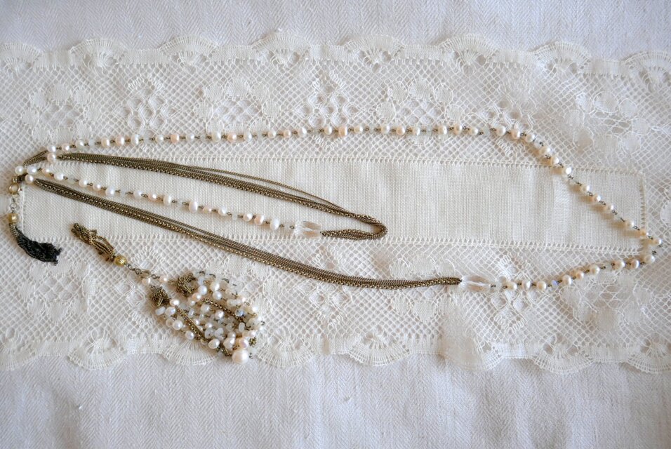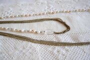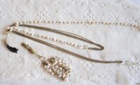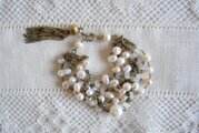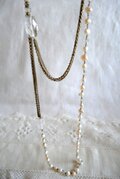淡水パールとクリスタル色のパーツ、細いチェーンを連ねた2連のネックレスと、