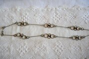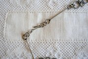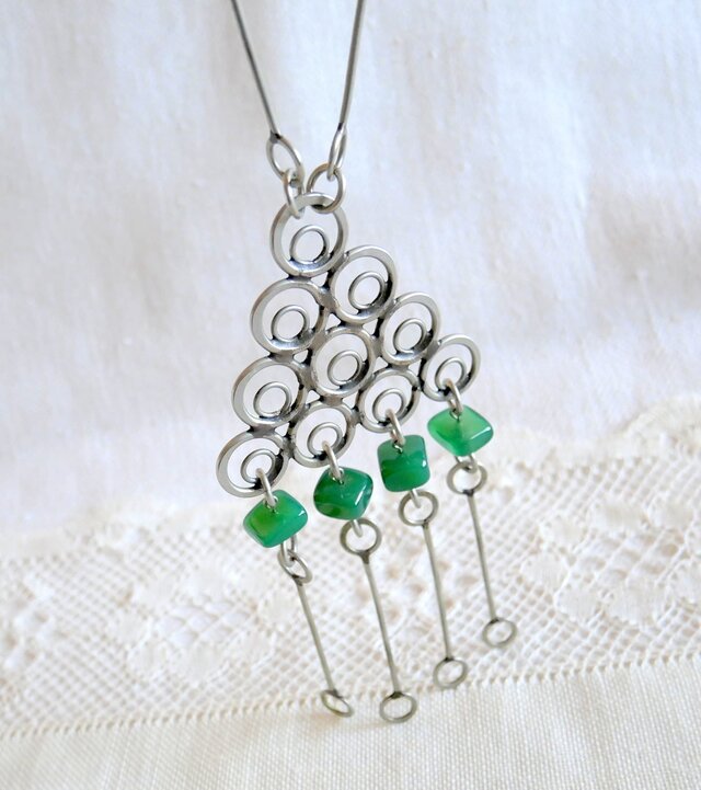輝きを抑えた金属のリングが繋がる凝ったチェーンと、