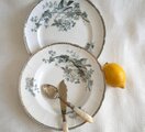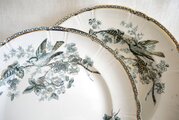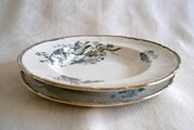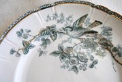 藍色に金彩の装飾で、鳥、ベリー、バラ、花、ミツバチ、蝶の絵柄が愛らしい皿です。