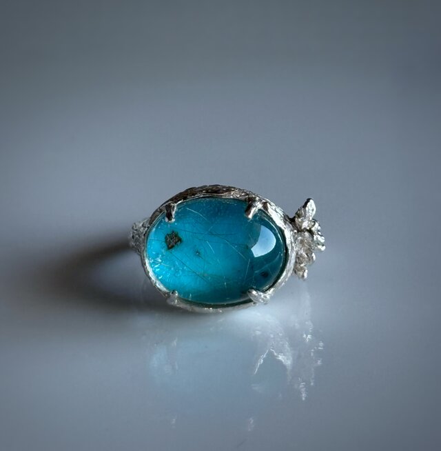 繊細な針状結晶を内包したルチルクォーツと鮮やかなブルーのターコイズのダブレットストーンを使って丁寧にお花の細工を施したリングにお仕立てしました。