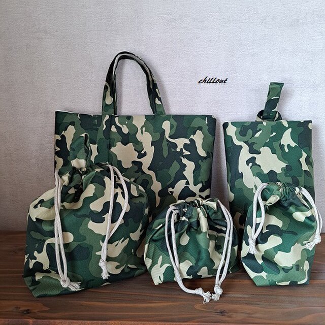 ミリタリーサファリ柄の入園バッグ5点セットが出来上がりました。
