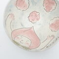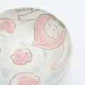 桃色の帽子をかぶった子が、ふんわり浮かぶ雲に囲まれて、元気に両手を広げているデザイン。優しいピンクと淡いブルーの化粧土を使い、一点一点、竹籤(たけひぐし)で丁寧に描き出しました。