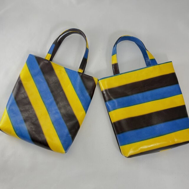 楽しく明るいプリント革のトートバッグ。