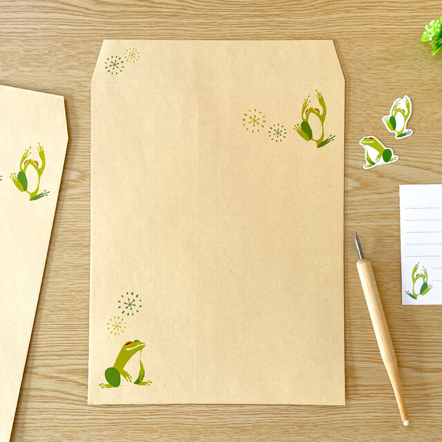 素朴なクラフト紙にカエルのイラストをプリントした角5封筒です。