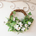 ナチュラルグリーンと白いローズのハーフリース 通年飾れるグリーンリース