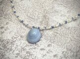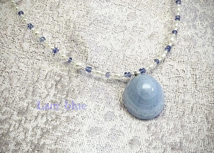 コロンとした一粒の大きなブルーレースアゲートを胸元に。良質の淡水ケシとタンザナイトで爽やかなネックレスに仕立てました。可愛らしさと品の良さ。そして涼し気な色合いもお洒落をワンランクアップさせる一品としておススメです。