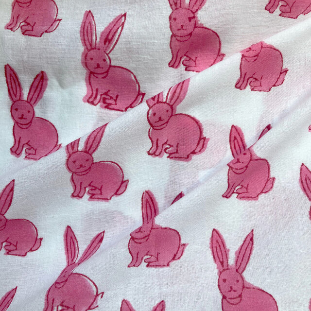 インド ブロックプリント生地 [50cm] サンガネリ ラビット コスモス ピンク うさぎ 兎 IF0484