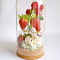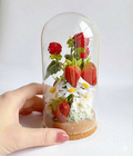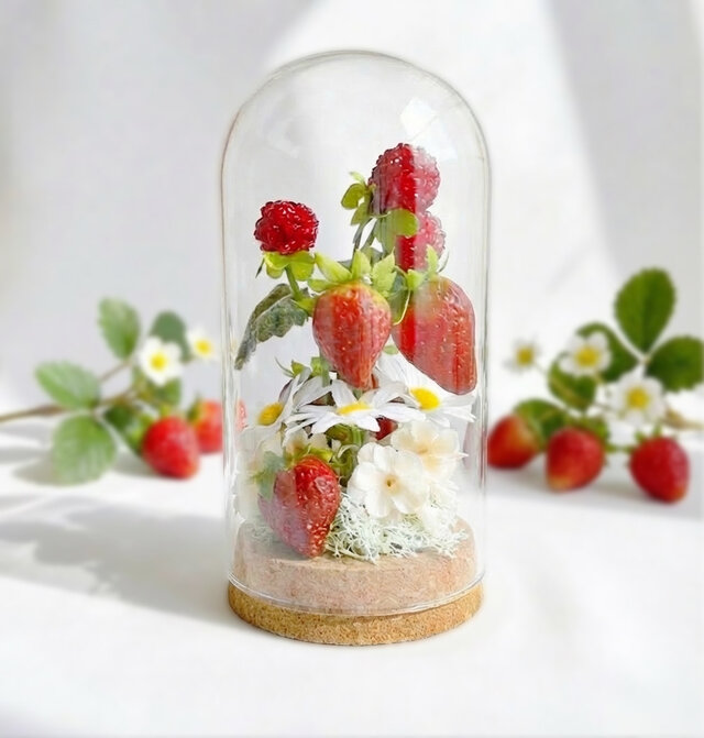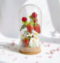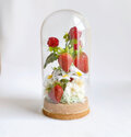 厳選した高級アーティフィシャルフラワーを使用し、いちごとラズベリー、白い小花を立体的にアレンジしました。ガラスドームがほこりから守ってくれるので、お手入れも簡単。長くきれいな状態で飾っていただけます。