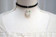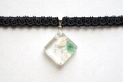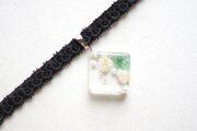 青緑とオフホワイトのお花、パール、ブリオンを沈めた四角いレジンを、ベルベットリボンにタティングレースで装飾を施したチョーカーに仕上げました。