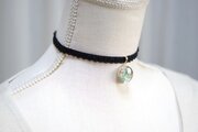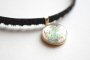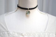 光沢のある二種類のグリーンが爽やかに、優しく、光を照り返すレジンを、ベルベットリボンにタティングレースで装飾を施したチョーカーに仕上げました。