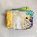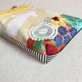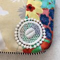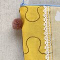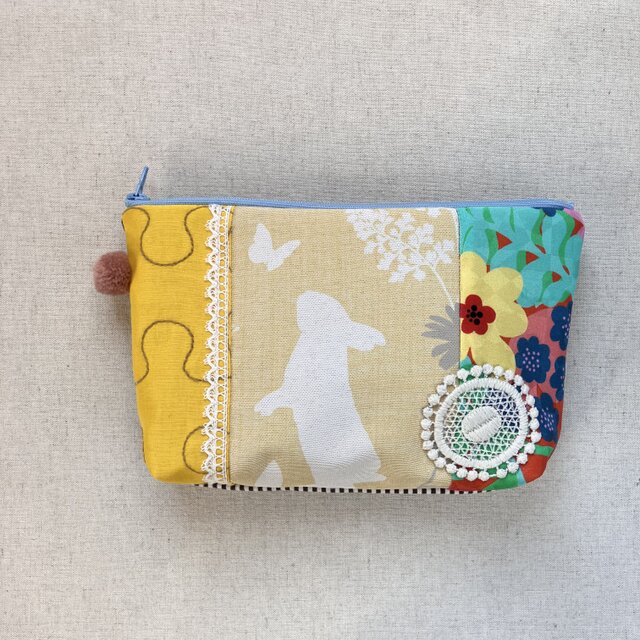 イエローメインの春色のポーチです。ウサギと蝶の柄やカラフルな花柄などを合わせ、レースや丸いモチーフを飾りました。