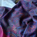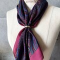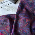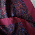ワインカラーのようなバーガンディカラーをベースに、ブルー、ブラック、ベージュで大胆に描かれたペイズリープリントスカーフ。