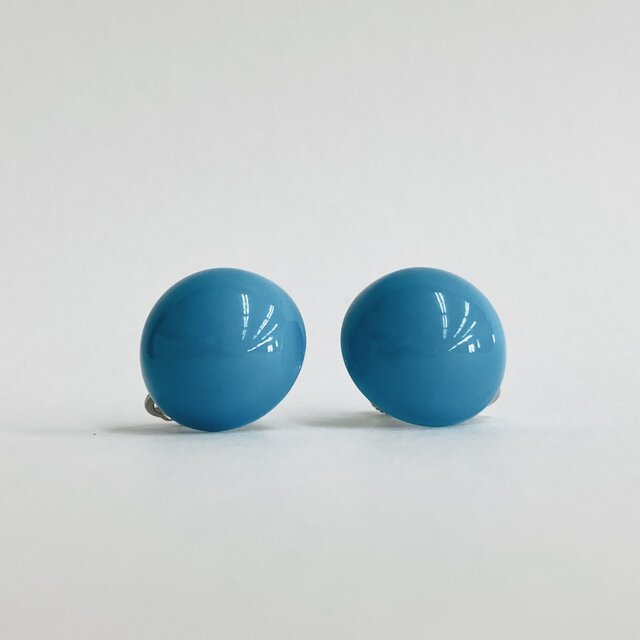 こちらは樹脂素材の丸玉パーツに、オリジナル塗料にて何層にも渡り重ね塗りを施した日本製樹脂塗装ビーズイヤリングになっております。ビーズカラーは爽やかなターコイズブルー。ビーズサイズは直径約20mm弱のカボションタイプ。丸玉の半分をカットした半丸となっております。※金具には脱着も比較的簡単で調節も可能なネジバネタイプを使用。