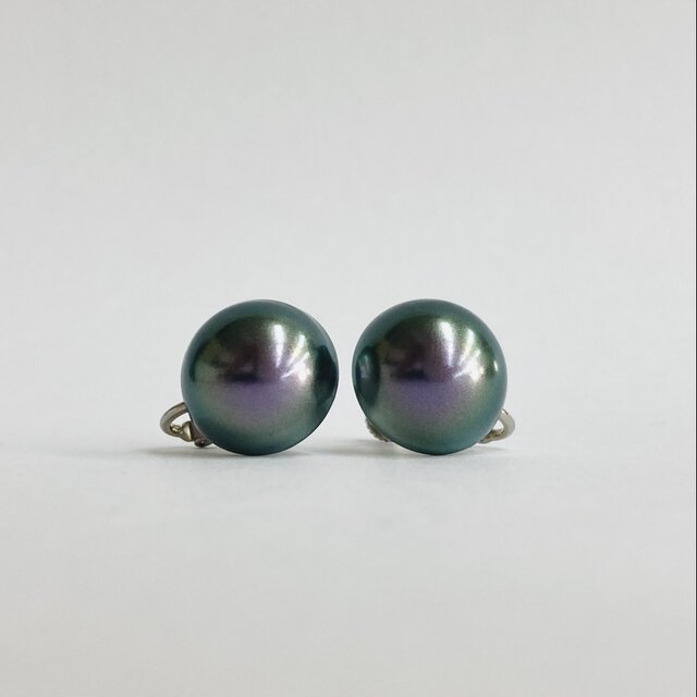 樹脂製のカボションパーツに、オリジナル塗料にて何層にも渡り重ね塗りを施した日本製樹脂パールイヤリングになります。パールカラーは、きめ細かい質感と優しい艶感が特徴のタヒチアンパープル色。紫をベースにほのかなグリーンの干渉色の浮かぶ個性的な色合いとなっております。パールサイズは直径約16mmのカボションタイプ。存在感のあるサイズ感ながら半分にカットしたカボションタイプでお使いいただきやすいフォルムです。イヤリング金具にはネジバネタイプを使用。付け外しもしやすく、ネジ部分での微調整も可能です。