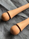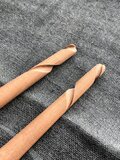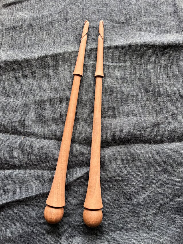 フレンチスピンドルタイプで、上端に螺旋の溝が彫ってあります。この溝に糸を引っ掛けて、接地させずに回転させて紡ぎます。螺旋の溝が左回り(最上端中央から見て反時計回り)のものが阿(写真左)、右回り(最上端中央から見て時計回り)のものが呍(写真右)です。阿はS撚り、呍はZ撚り専用です。阿は左手、呍は右手で回すと回しやすいです。