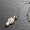 チェーンには、ヴィンテージの真鍮リングをくぐらせ、コロンと存在感のある貝パールで美しいバランスのペンダントになりました。ミルクティー色のマザーオブパールも、雰囲気を添えてくれています。