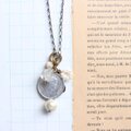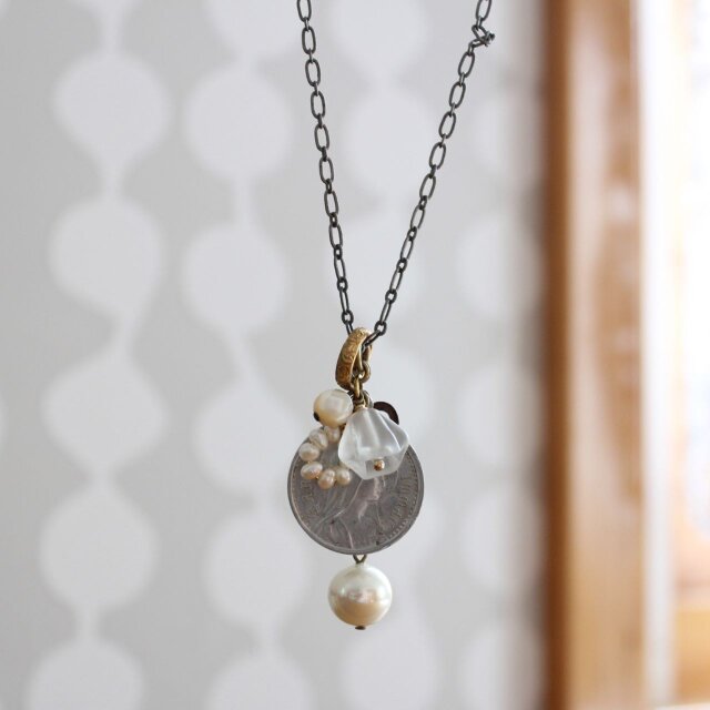 フランスのアンティーク・マリアメダイをメインに、ヴィンテージのガラスの花や、淡水パールのモチーフが揺れる、ありそうでないデザインのペンダント・ネックレスです。