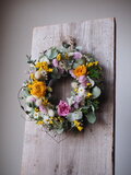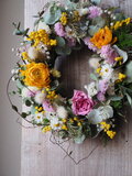 春らしい色合いの小花を、空気を含ませながら ふんわりと紡ぎ、風に吹かれたように動きのあるワイヤープランツのツルをあしらい、春風が通り抜けたかのような軽やかな立体感を表現しました。