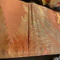 柔らかなサーモンピンクに、黄金色に輝く大きな葉の文様。ラベンダーシルバーの帯紐が、凛としたエッジを付与。自分だけの美学を貫きたい日に。