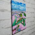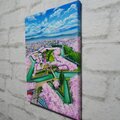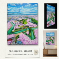特に注目すべきなのは、圧倒的な色彩の対比です。画面を埋め尽くすソメイヨシノの淡いピンクと、堀に映る澄んだ水色、そしてその背後に広がる高い青空。鮮やかなコントラストはお部屋を明るく、華やかな春の空気感で満たしてくれます。さらに、油彩ならではの重厚感と繊細なタッチが、桜の花びら一枚一枚の生命力を表現し、光の当たり方によって豊かに変化する表情は、まさにこの作品の大きな魅力です。