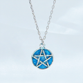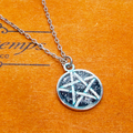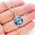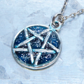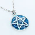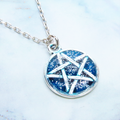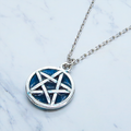 落ち着きのあるアンティークシルバーカラーのペンタグラム(五芒星)モチーフに、鮮やかなブルーカラーのレジンで加工を施したペンダントネックレスです