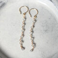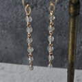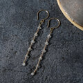 朝露のようなしっとりとした輝きが素敵なブリオレットカットの小さなナチュラルダイヤモンドにヴィンテージライクなグレームーンストーンのボールビーズをあわせてピアスに仕立てました。