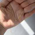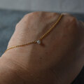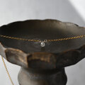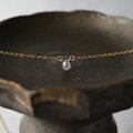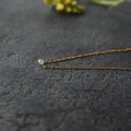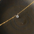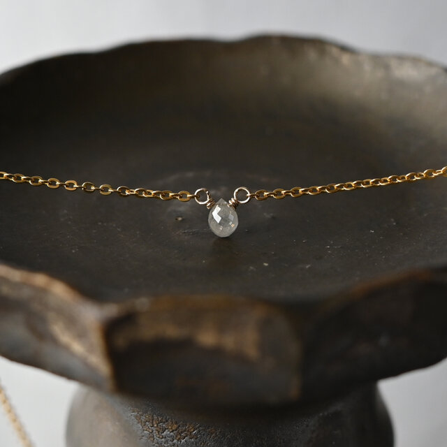 朝露のようなしっとりとした輝きが素敵なブリオレットカットのナチュラルダイヤモンドを一粒タイプのネックレスに仕立てました。シックな色合いのグレーカラー。ダイヤモンド特有の濡れたような輝きが素晴らしく、とても小さな粒ですが存在感があります。シンプルでさりげないデザインはフォーマルはもちろん華美なアクセサリーがつけられないオフィスでの装いにも。首周りは40センチ。トップが小さいのでアジャスターはありません。