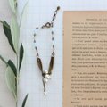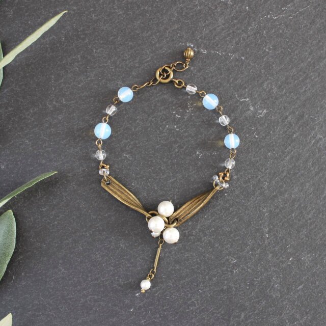 うねるようなデザインの真鍮をヤドリギの葉に、小さなパールが集まる様子を実に、そして、揺らせた小さなバーを茎に見立てたら、愛らしいヤドリギを表現したブレスレットになりました。