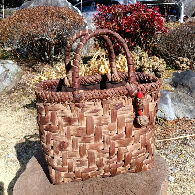 貴重な山葡萄の蔓で編んだ手提げ籠(バッグ) 【中】20260201-1 チャーム付き