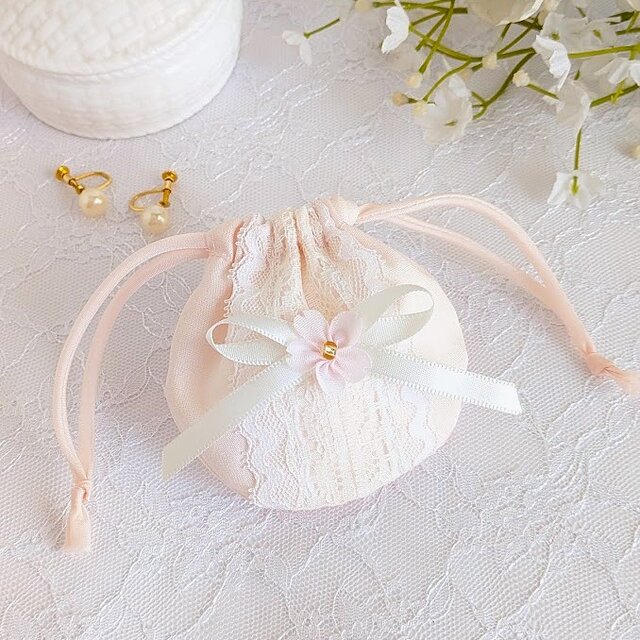 やさしいピンク色の生地にレースを合わせた可愛らしいミニ巾着です。