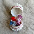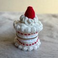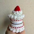 ケーキ型の編み物ポーチ、ホワイトとレッドの配色で可愛らしいデザインです。